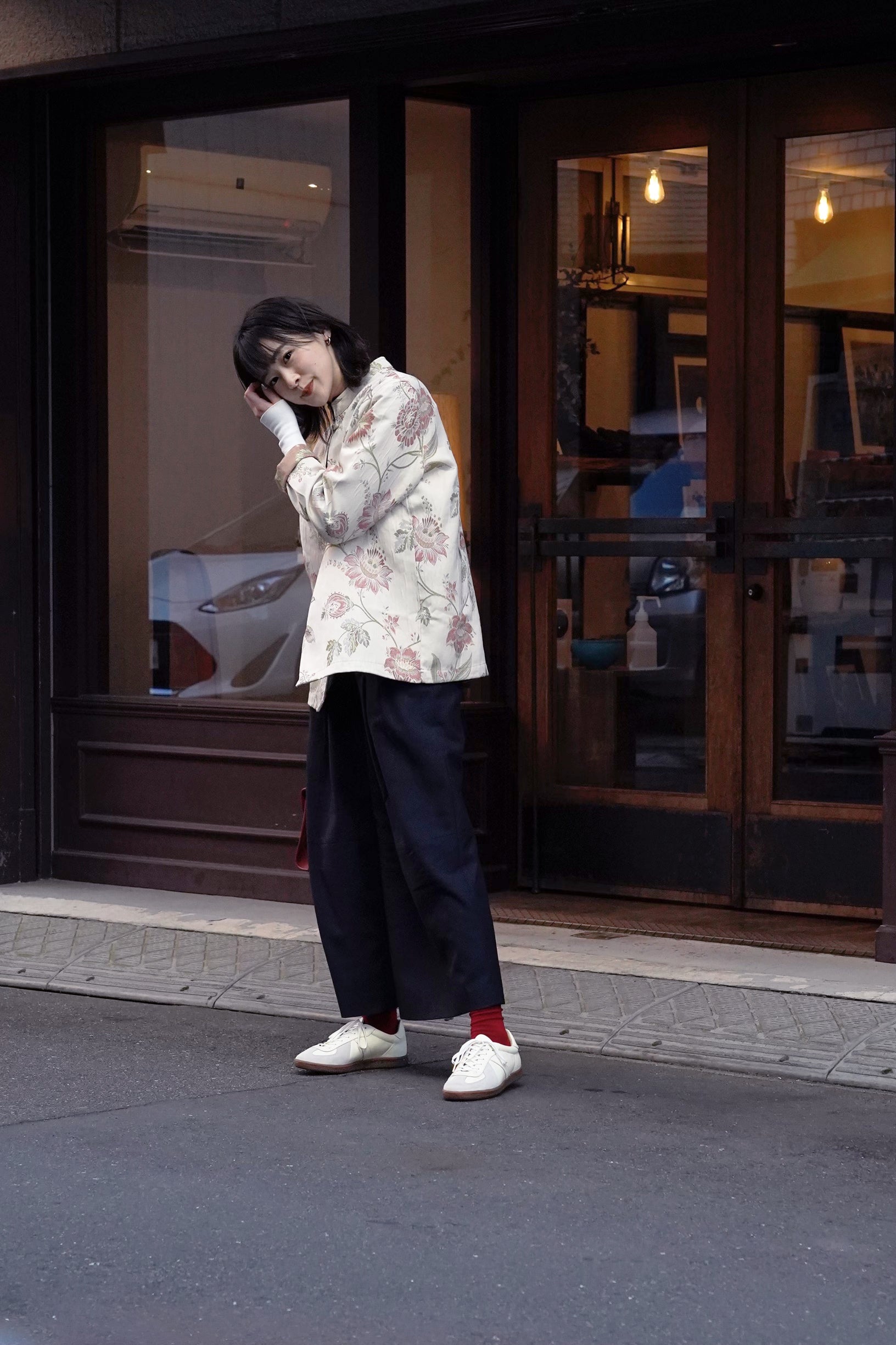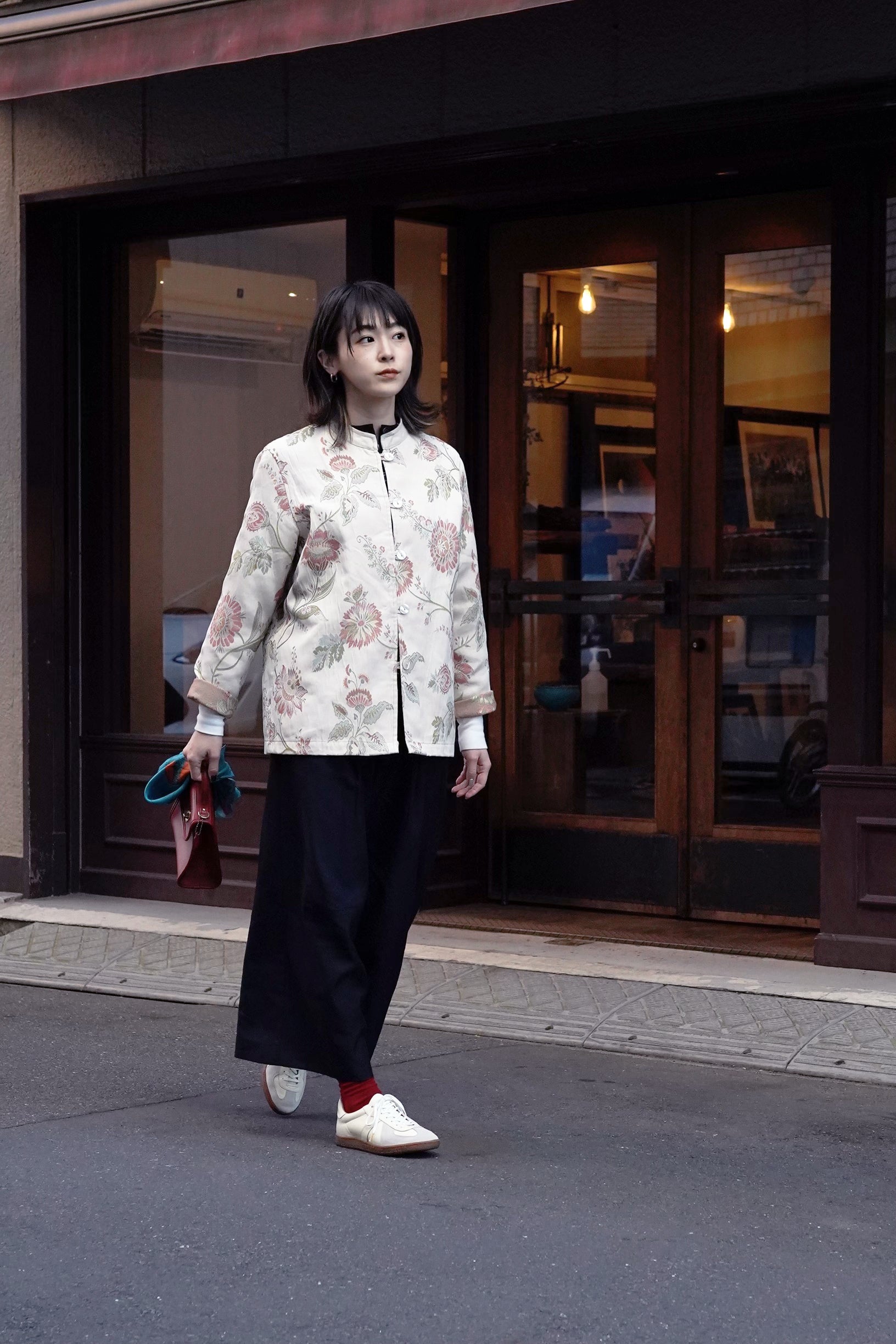 女性らしいカラーでミリタリーと合わせやすいが、落ち着いた大人っぽい素材、カラーを選定。